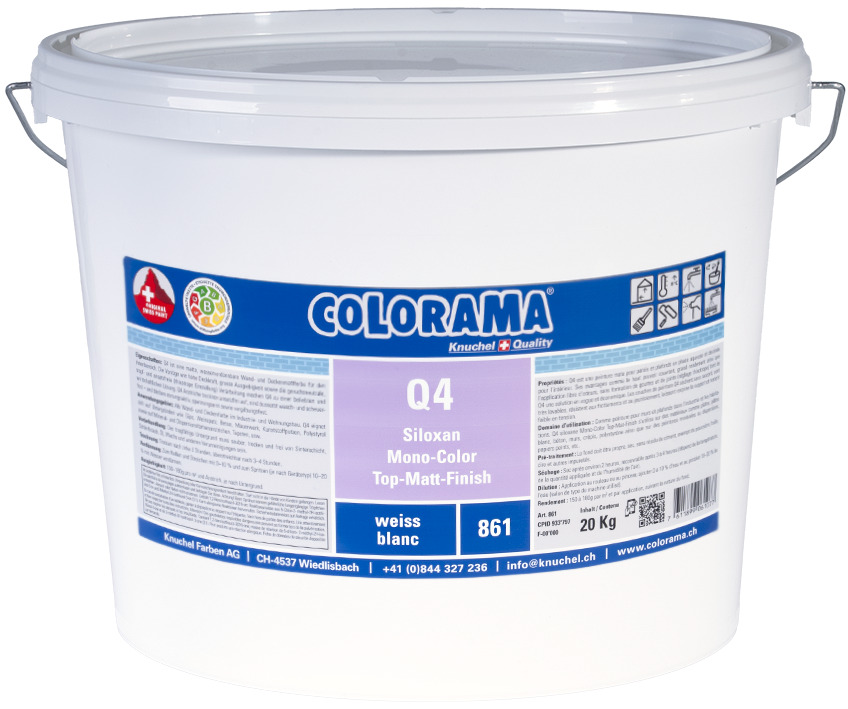 COLORAMA Q4 ist eine matte, wasserverdünnbare Wand- und Deckenmattfarbe für den Innenbereich. Die Vorzüge wie hohe Deckkraft, grosse Ausgiebigkeit sowie die geruchsneutrale, tropf- und ansatzfreie (thixotrope Einstellung) Verarbeitung machen COLORAMA Q4 zu einer beliebten und wirtschaftlichen Lösung. COLORAMA Q4 Anstriche trocknen ansatzfrei auf, sind äusserst wasch- und scheuerfest – und bleiben atmungsaktiv, spannungsarm sowie vergilbungsfest.