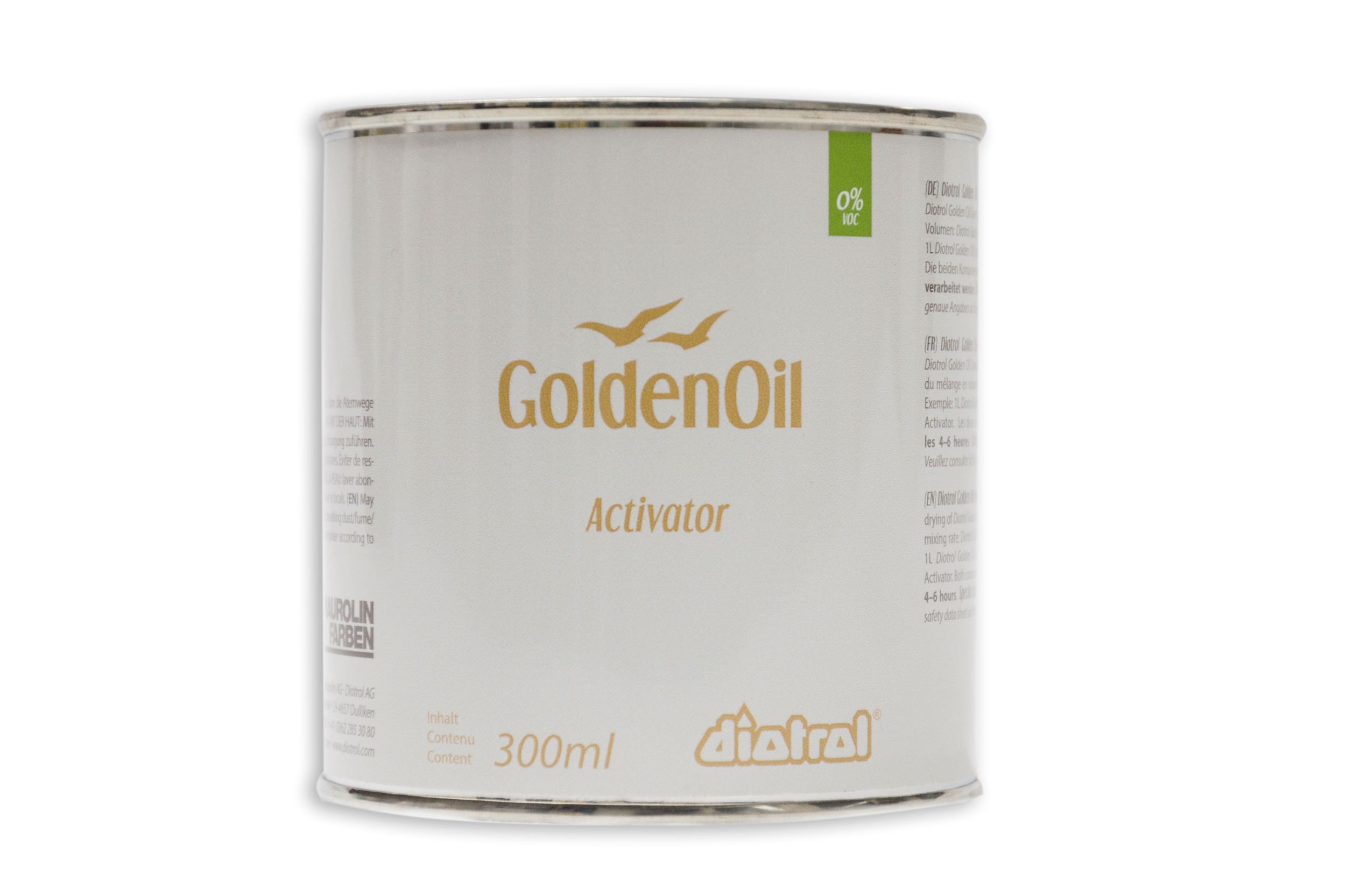 Diotrol Golden Oil Activator ist eine flüssige Komponente zur beschleunigten Aushärtung von Diotrol Golden Oil Onecoat und Alba White. Diotrol Golden Oil Activator enthält 0% VOC. Neben der schnelleren Trocknung des Diotrol Golden Oil Onecoat und Alba White ergibt sich auch eine höhere Widerstandsfähigkeit der Oberfläche gegenüber Abrieb und Haushaltsflüssigkeiten.