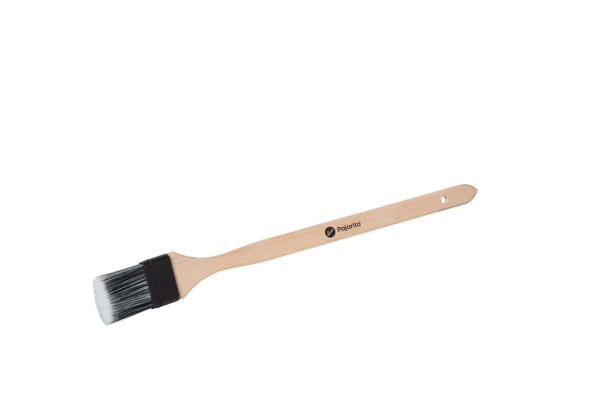 Bestehend aus Kunstfasern, verbunden mit einer gebogenen, schwarzen Kunststoff-Fassung und langem rohem Holzstiel.