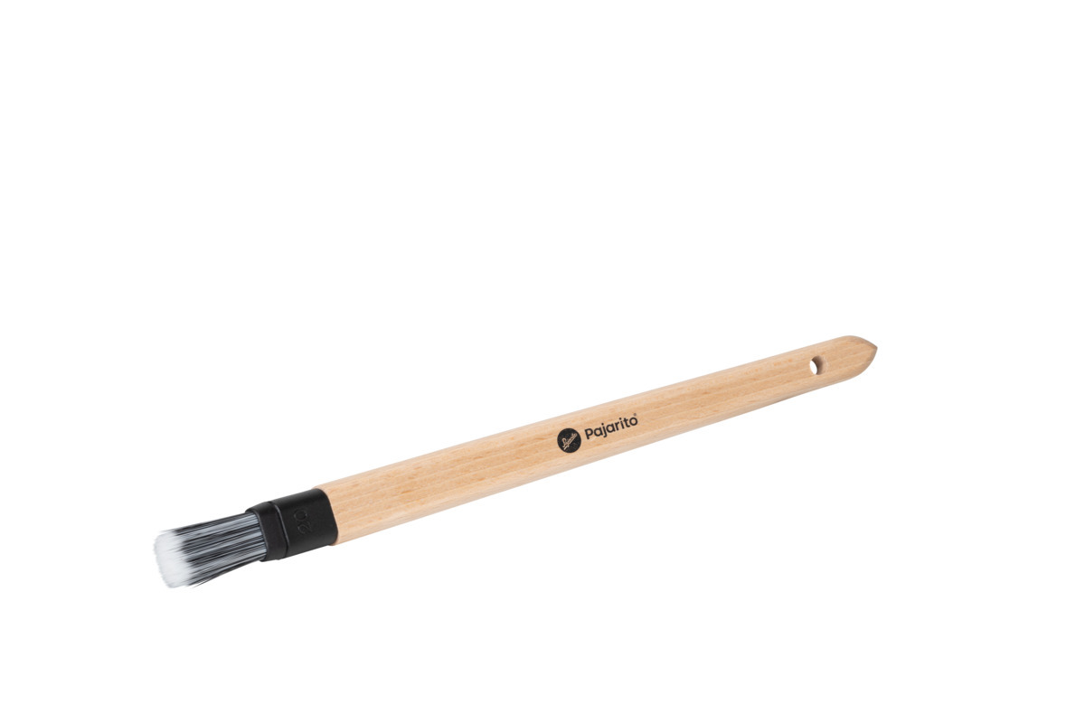 Bestehend aus Kunstfasern mit einer gebogenen schwarzen Kunststoff-Fassung und rohem Holzstiel.