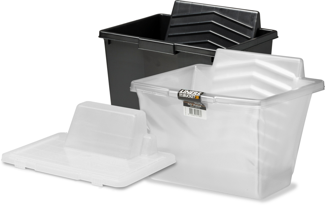 Der Bucket ist ein stabiler Farbbehälter mit der typischen schrägen Abrollfläche.