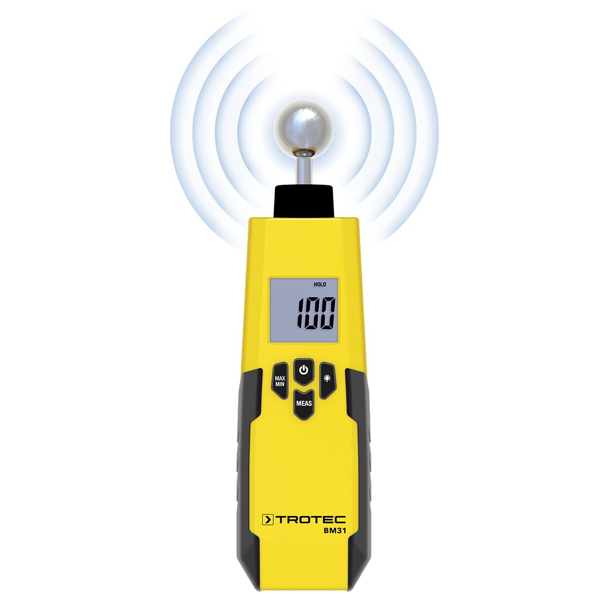 Feuchtigkeitsmesser für die schnelle und zerstörungsfreie Lokalisierung von Feuchteverteilungen in oberflächennahen Bereichen verschiedener Materialien, beleuchtetes LCD Display, Autoabschaltung, Batterien und Kurzanleitung.