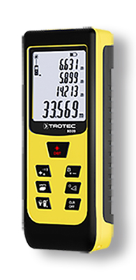 Distanz-, Flächen- und Volumenberechnung, Pythagoras-Funktion für Indirektmessungen, Messbereich 0,05 bis 70 m, Genauigkeit +/- 2,0 mm, IP54: staub- und spritzwassergeschützt, inkl. Tasche, Handschlaufe, Batterien und Kurzanleitung.