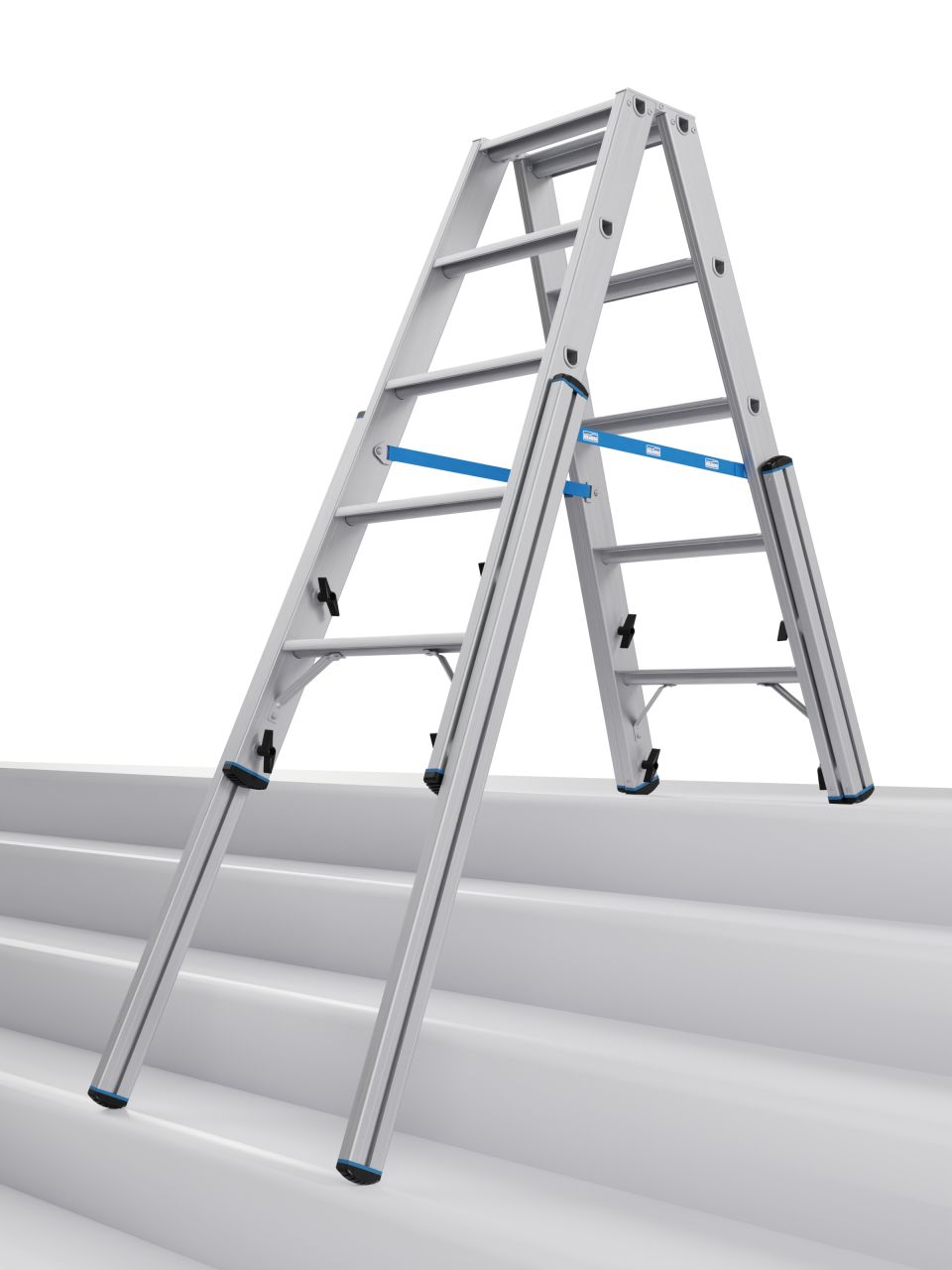Entwickelt für professionelle Einsatzzwecke, bietet diese Aluminium-Teleskop-Doppelleiter mit Treppenfunktion hohe Standsicherheit, auch im Einsatz auf Treppen, Absätzen, Podesten und ähnlichen Höhenunterschieden.
